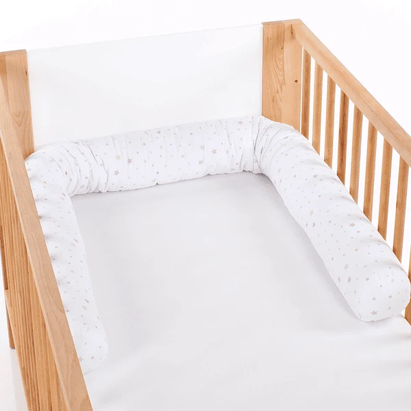 Veel kinderen slapen het best op hun zij. Dat is waar de nestslang in beeld komt – als een steunkussen. Het is royaal gevuld met hypoallergene siliconenwol, zodat het niet te zacht maar ook niet te hard is en daardoor als optimale steun kan dienen. Met zijn aangenaam zachte, 100% katoenen oppervlak, beschermt het uw lieveling tegen het houten frame van het ledikant. Zowel de hoogwaardige vulling als het oppervlak voldoen aan de hoogste kwaliteit en garanderen zowel de veiligheid als het comfort van uw kind. Bovendien is de nestslang veelzijdig – of het nu in het wiegje, in de box of als speelkameraadje is, de nestslang past zich dankzij zijn flexibiliteit aan alle omstandigheden aan. Bovendien kan hij worden gebruikt als een all-round bescherming op de luiertafel. Als hij niet meer nodig is in het bed, dient hij als speelkameraadje of als tochtstopper.