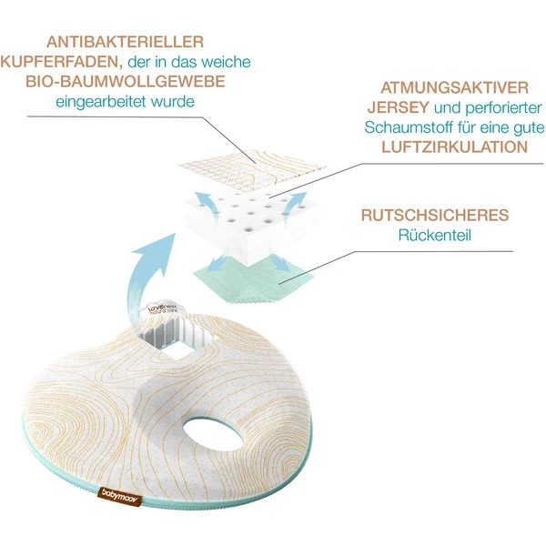 De Lovenest Natural Care is speciaal ontworpen voor baby’s met een gevoelig immuunsysteem. Het in het biologische katoennet aden geweven koperf elimineert 99,9% van de bacteriën, vermindert geuren en beschermt de huid tegen infecties. De gebruikte technologie is natuurlijk en vereist geen chemische behandeling. Een bijkomend voordeel van dit opbergkussen: de Lovenest Natural Care kan in de machine worden gewassen op 30° zonder de antibacteriële eigenschappen van de koperdraad te verliezen. Het babyhoofdkussen tegen het platte hoofd kan vanaf de geboorte van uw kind worden gebruikt.