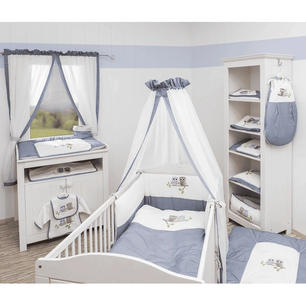 Het nestje en het beddengoed zijn versierd met twee schattige uilen.