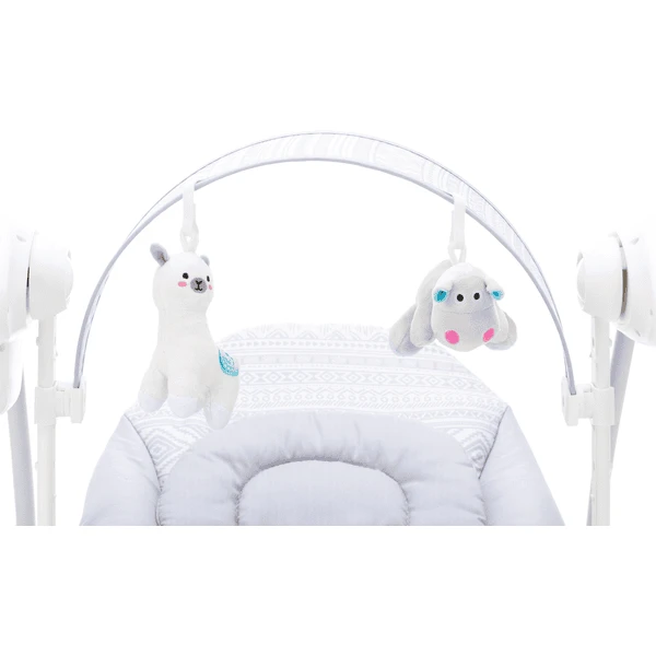 De schommel is zeer stabiel en stabiel en kan worden gebruikt met de meegeleverde voeding (230V) of 4x C-LR14 batterijen (niet meegeleverd). Het 5-punts veiligheidsharnas houdt de baby stevig in de schommel en zorgt zo voor de nodige veiligheid.
