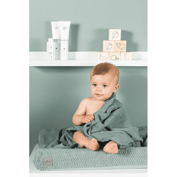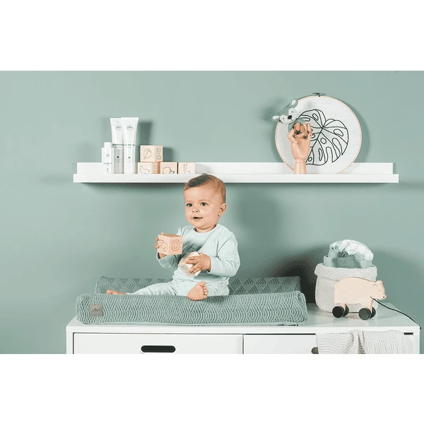 Deze gebreide hoes voor aankleedkussen bevat in het midden een badstof inlay.