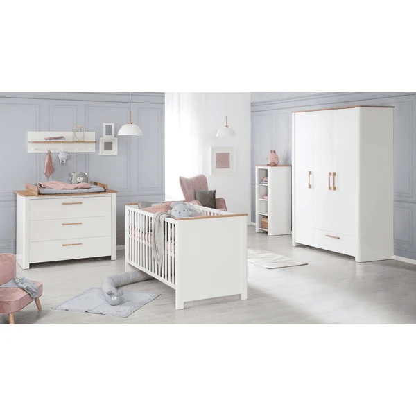 De kleerkast Ava heeft 3 deuren en een lade met hoogwaardige massief houten handgrepen in eiken. Binnenin de kleerkast houden 5 legplanken en een kledingroede alles netjes. Dankzij de ingebouwde soft-close technologie sluiten de deuren en lades aden zacht en geruisloos. De babygarderobe is ontwikkeld in Duitsland en wordt geproduceerd in de EU.