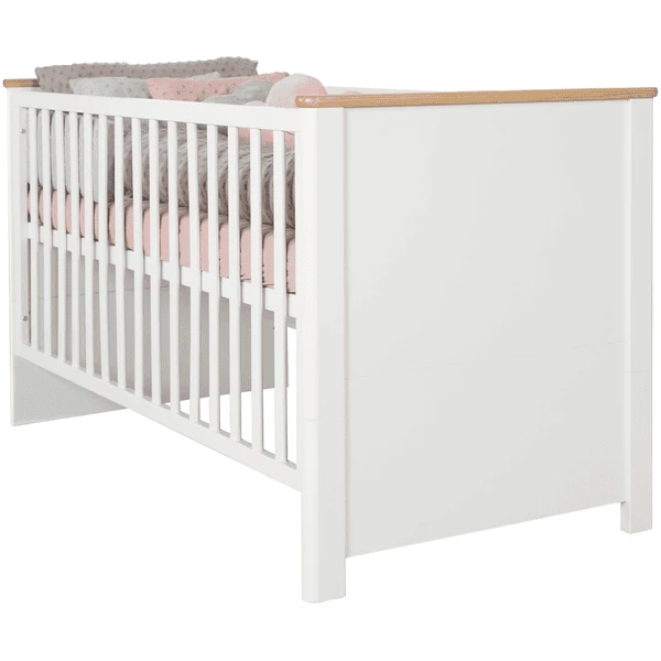 Het kindercombinatiebed roba heeft witte fronten met sierlijsten op het bovenste bedhoofd in het trendy decor “Artisan eiken”. Het ligoppervlak van het bed is 70 x 140 cm. Om gemakkelijk in en uit het bed te stappen, kunnen 3 glijdende sporten worden verwijderd. Het ligvlak is in hoogte verstelbaar en kan in 3 verschillende posities worden vastgezet. Het kinderbedje kan worden omgebouwd tot een Junior bed met de extra ombouwkanten. Alle gebruikte materialen zijn getest op schadelijke stoffen. Alle oppervlakken zijn afveegbaar en gemakkelijk schoon te maken.