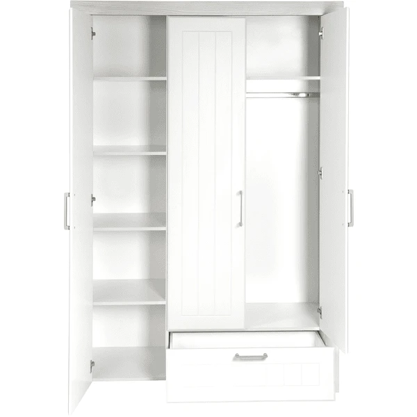 De kinderkledingkast in wit met bovenpaneel in Luna Elm-decor is voorzien van een uitgewerkte kooffrees, hoogwaardige Metal handgrepen en zijdelingse noppen en past ideaal in elke baby- en kinderkamer.