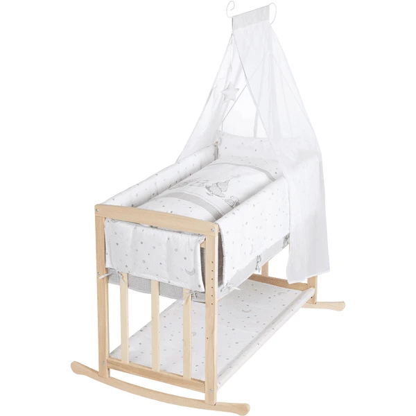 Het wiegje roba 4 in 1 is geschikt vanaf de geboorte en groeit met het kind mee tot een wiegje voor oudere kinderen. Het multifunctionele talent is ook gemakkelijk in elkaar te zetten (ca. 30 minuten). Het wiegje en de complete uitrusting zijn TĂśV-getest en ontwikkeld en geproduceerd met een veiligheidsbarrière volgens de nieuwste veiligheidsnormen van de EN 1130:2019-norm. Alle materialen die gebruikt worden in de roba Stubenbett Babysitter 4 in 1 zijn getest op schadelijke stoffen, gecertificeerd en worden regelmatig gecontroleerd. Het roba wiegje ‘Sternenzauber’ met platte spijlen is gemaakt van massief hout (beuken). Het ligvlak is 90 x 45 cm.