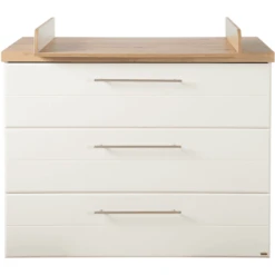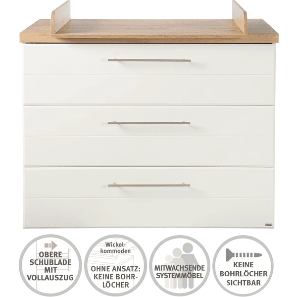 Het verschoonoppervlak is geschikt voor verschoonkussens tot 85 x 75 cm. De gewatteerde roba aankleedkussens in de maat 85 cm x 75 cm zijn perfect afgestemd op de afmetingen van de commode en toveren de commode om tot een gezellige verschoonplek. De commode kan rechts, in het midden of links van de commode worden geplaatst. De bovenkant van de drie lades aden van de roba verschoonunit kan volledig worden uitgetrokken. De luiertafel is een echte allrounder. Als u de delen van het bovenblad van de luiertafel verwijdert, wordt de luiertafel een ladenkast zonder zichtbare schroeven in de bovenplaat.