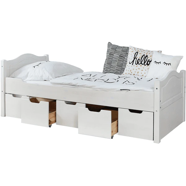 Het Leni eenpersoonsbed overtuigt met mooie hoofd- en voeteneinden en kan eenvoudig worden uitgebreid met praktische functies dankzij de verschillende laden aden . Gemaakt van hoogwaardig dennenhout.